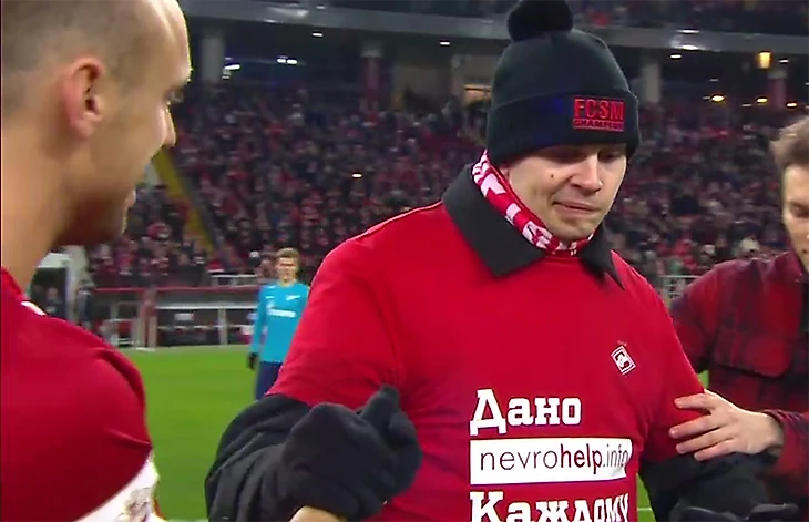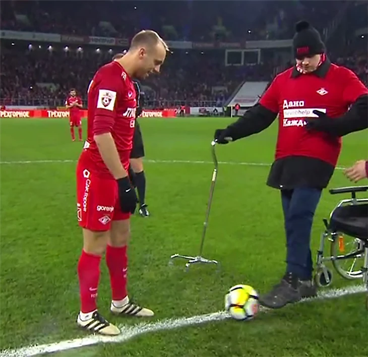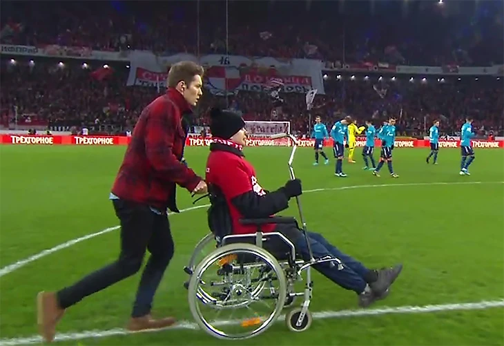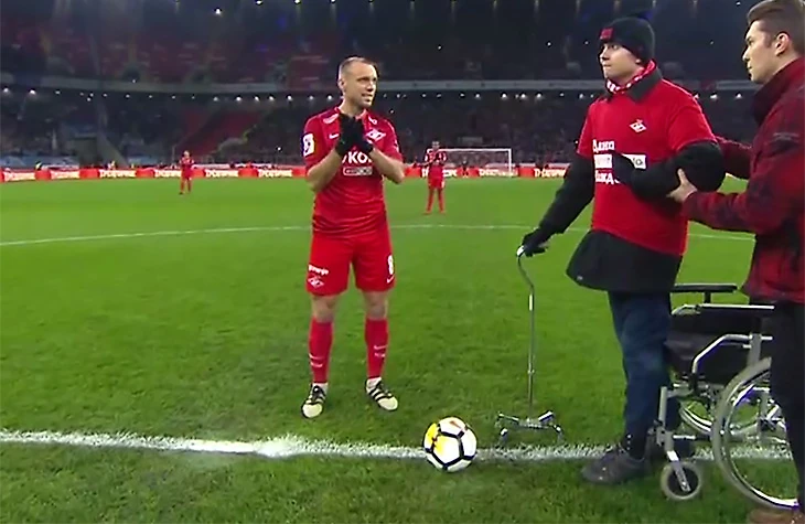 Первый удар по мячу в матче «Спартака» и «Зенита» сегодня нанес парень по имени Петя. Он болельщик «Спартака», который летом 2014-го перенес инсульт и оказался в коляске.