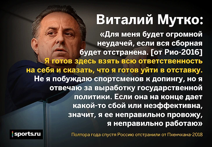 Летом 2016-го Виталий Мутко появился в эфире «Матч ТВ», где Юрий Дудь спросил у него: «Что должно случиться, чтобы вы ушли в отставку?» Тогда еще были разговоры, что сборную России могу отстранить от Олимпиады в Рио. Мутко ответил так: