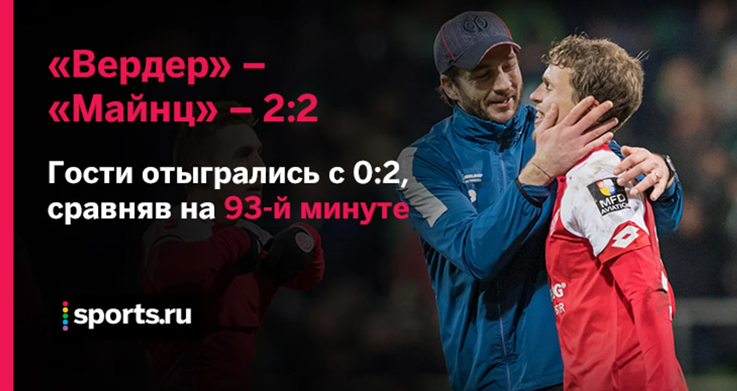 «Вердер» мог выбраться из зоны вылета, держал 2:0 к 70-й минуте, но «Майнц» дожал. Защитник Фабиан Фрай пришел в чужую штрафную на 90-й минуте и все решил.