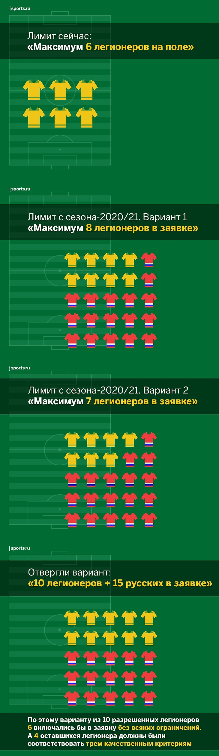РФПЛ в конце ноября поддержала формат «10 легионеров + 15 русских». Но Виталий Мутко еще в июле сказал, что этого не будет: «Легионеров будет меньше». Президент «Зенита» Сергей Фурсенко тоже выступал против резких перемен: «Думаю, сегодня ничего не надо менять. Надо дать возможность российскому футболу развиваться в стабильных условиях, хватит устраивать эксперименты и ставить над нами опыты».