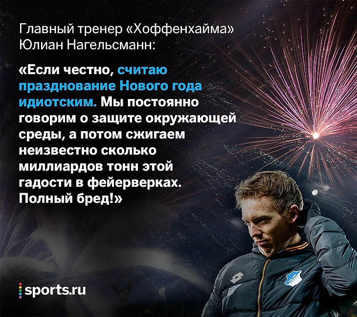Сразу после выхода с каникул главный тренер «Хоффенхайма» Юлиан Нагельсманн прогремел мощным признанием: ему совсем не нравится празднование Нового года. Причина – развлечения народа с салютами после боя часов в 00:00.