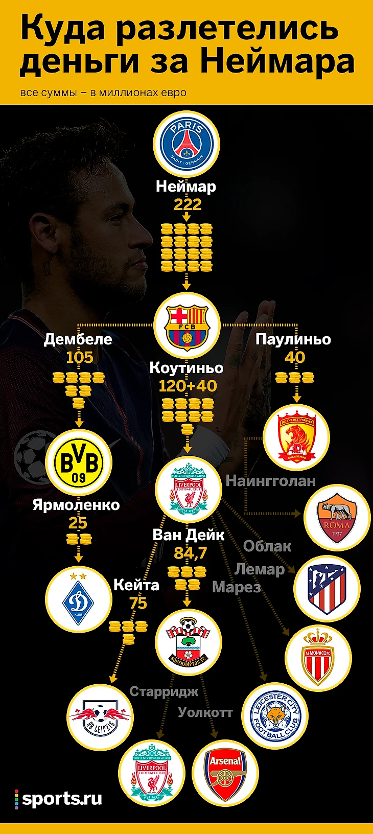 Летом 2017-го «ПСЖ» больше чем в два раза увеличил мировой трансферный рекорд, заплатив «Барселоне» за Неймара 222 миллиона евро. «Барселона» беречь богатство не стала и пустила деньги в дело. Волны этого трансферного взрыва не утихнут еще долго. Цены на игроков стали еще безумнее.