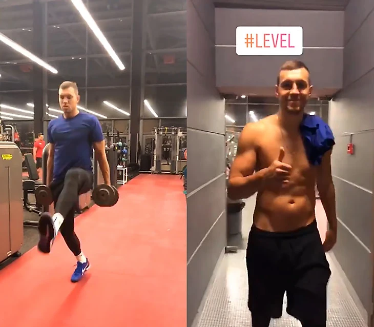 Вечером вторника Артем Дзюба агрессивно ворвался в инстаграм. Сначала он выложил серию коротких видео в режиме сторис. На первом он крутит педали на велотренажере (под хэштег #Здоровкаклев), на втором – приседает (хэштег – #готовнавсе100). Дальше Артем делает выпады с гантелями, жим ногами, еще пару упражнений на укрепление мышц ног и под конец выходит из зала с голым торсом.