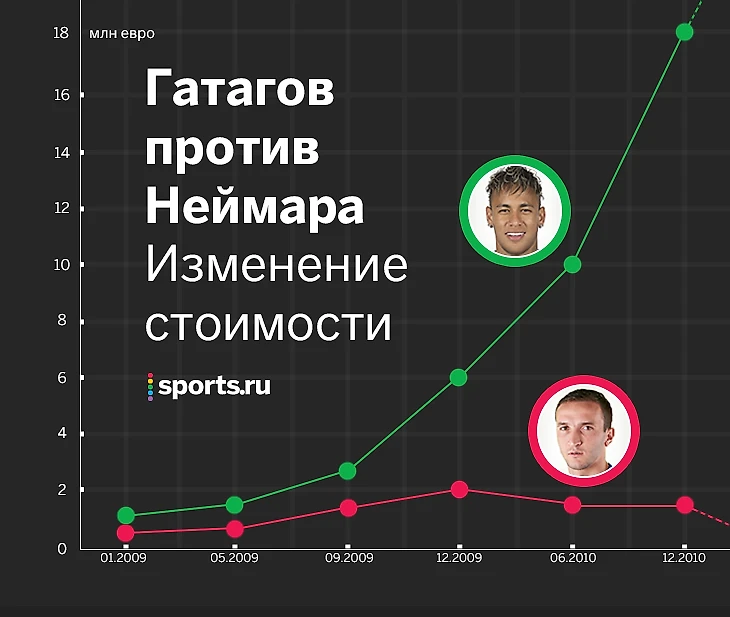 9 лет назад Гатагов и правда был близок к Неймару, если смотреть графики Transfermarkt. Российский футболист дебютировал в премьер-лиге, а бразилец пробивался в состав «Сантоса».