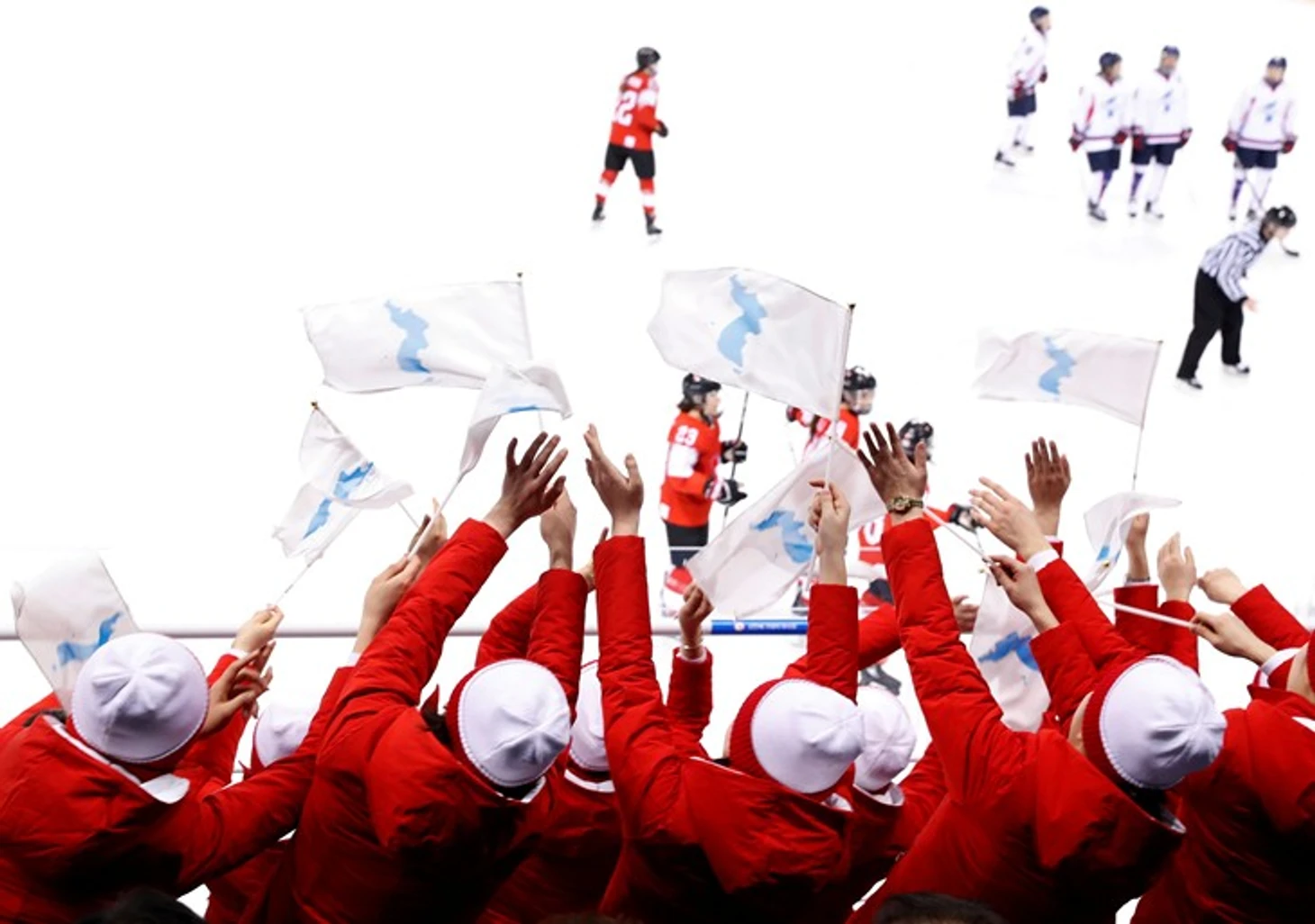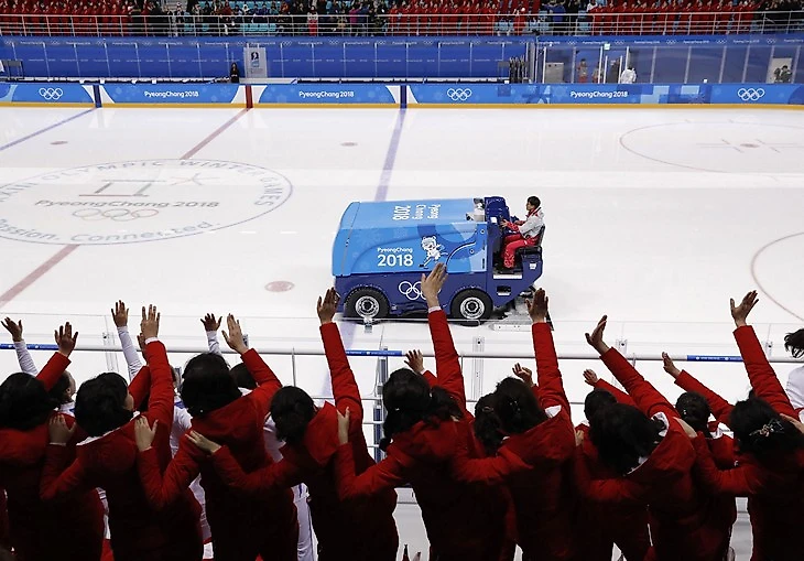 Болельщицы Северной Кореи поддержали женскую сборную объединенной Кореи на хоккейном матче против Швейцарии.