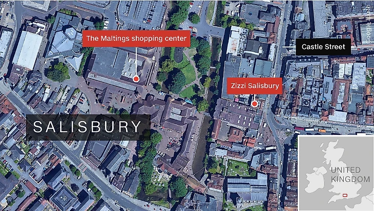 В воскресенье 66-летний Скрипаль и его 33-летняя дочь Юля упали рядом со скамейкой в торговом центре The Maltings в Салсбери. За какое-то время до этого они пообедали в ресторане Zizzi, который находится неподалеку.