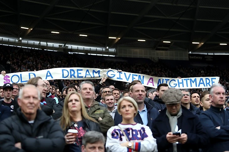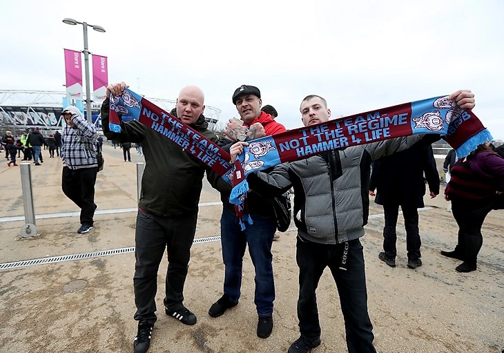Фанаты лондонского «Вест Хэма» давно ненавидят боссов клуба – сделавших огромные состояния в том числе на порнографии Дэвида Салливана и Дэвида Голда (а также вице-президента клуба, британскую медиазвезду Карен Брэди). В этом сезоне команда выступает совсем плохо (три очка от зоны вылета), перед сегодняшней игрой с «Бернли» болельщики лондонцев планировали масштабную акцию протеста.