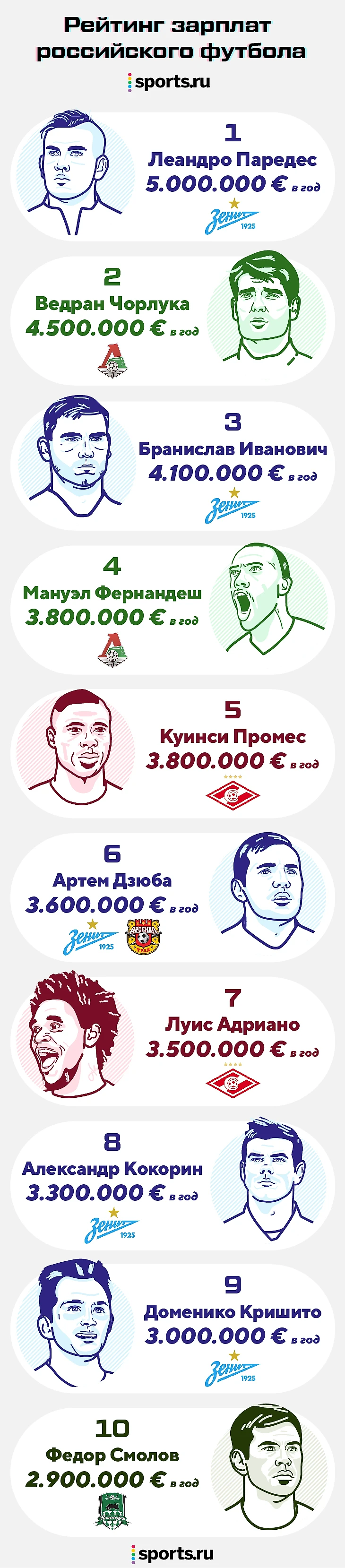 Важная особенность этой весны – чемпионат мира в России. Некоторые из тех, кто потерял место в основе топ-клубов, но мечтает сыграть на домашнем ЧМ, ушли в маленькие команды. Часто – с понижением зарплаты. Например, этой весной Артем Дзюба будет получать сильно меньше 300 тысяч евро в месяц: по информации Sports.ru, половину этой зарплаты ему компенсирует «Зенит», от 2 до 4 млн рублей платит тульский «Арсенал». Но в рейтинге указана его полная зарплата по состоянию на старт сезона в «Зените».