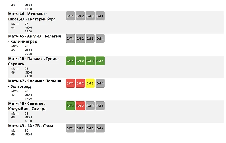 На специальном сервисе ФИФА можно проверить доступность мест на все матчи. На плей-офф распроданы почти все билеты, запущенные в продажу 13 марта. Осталось небольшое количество дорогих билетов на некоторые четвертьфиналы и матчи 1/8 финала. На 27 матчей из 64 сейчас нет ни одного свободного билета, включая первую категорию. Еще на 8 матчей остались только самые дорогие билеты. Самая доступная игра на эту минуту – Панама – Тунис, которая пройдет в Саранске. В доступе есть много билетов всех категорий.