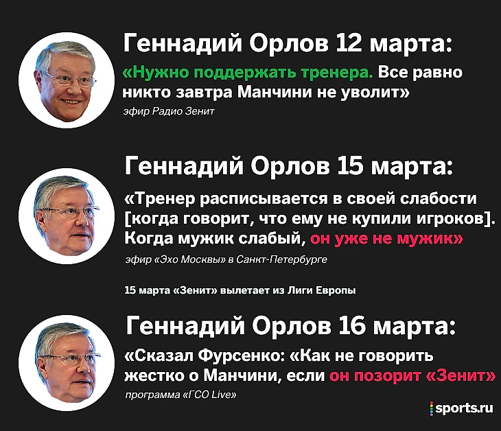 Геннадий Орлов попросил поддержать Манчини. И сказал Фурсенко, что тренер позорит «Зенит»
