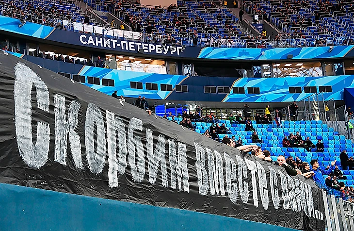 Самый резонансный плакат появился еще перед игрой. Служба безопасности стадиона попросила болельщиков убрать его – вероятно, из-за жесткой политической окраски.