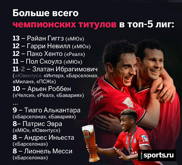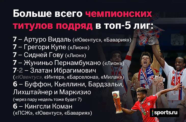С 6 чемпионствами подряд Коман еще ближе к рекорду: больше в топ-лигах пока только у Видаля и у звезд «Лиона», который в нулевых разрывал чемпионат Франции. Правда, совсем скоро к этой команде наверняка присоединятся Буффон с друзьями по «Ювентусу» – 7-я подряд победа в серии А, возможно, не так убедительна, но, кажется, неизбежна.