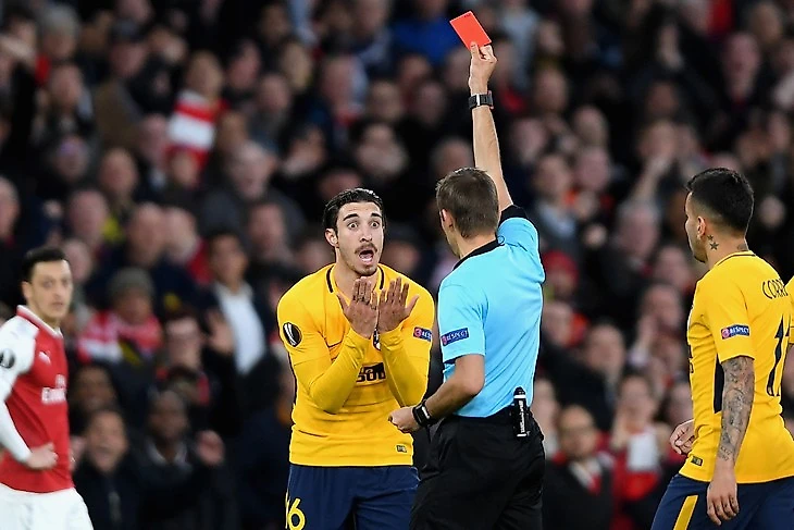 Первый полуфинал Лиги Европы начался для «Атлетико» просто кошмарно: уже на 10-й минуте судья Клеман Тюрпен удалил защитника Шиме Врсалько. Это было самое быстрое удаление мадридцев в еврокубках за всю историю, а еще – чуть ли не самое раннее удаление за две желтые карточки. За последние годы быстрее управился только Эктор Эррера из «Порту»: в матче с «Зенитом» в ЛЧ-2013/14 ему хватило 6 минут.