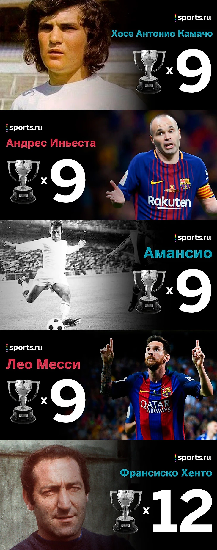 • Андрес Иньеста и Лионель Месси стали 9-кратными чемпионами Испании. Больше только у легенды «Реала» Франсиско Хенто – 12. По окончании сезона Иньеста покинет «Барсу».