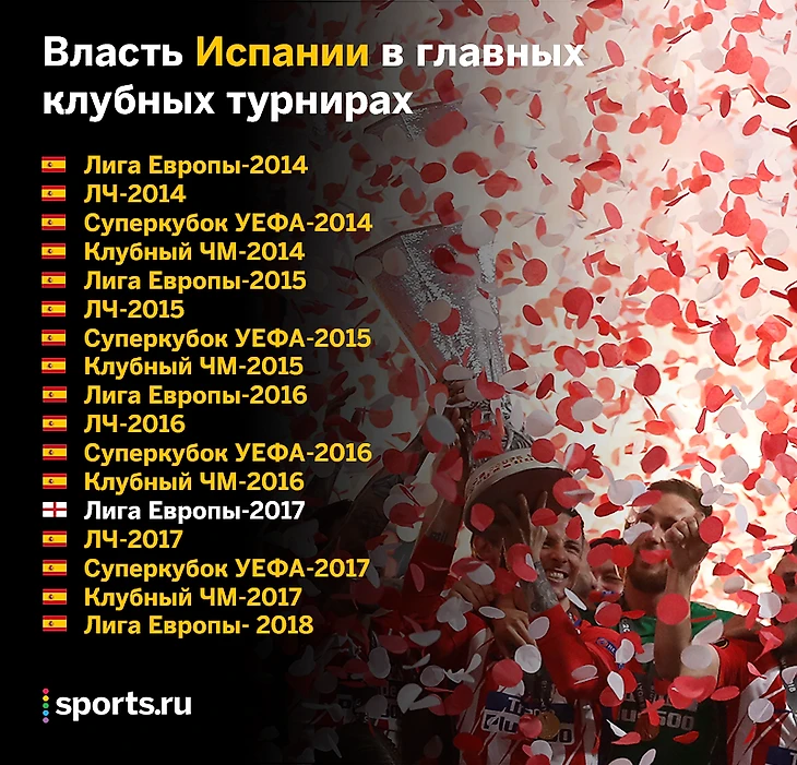 • Еще более безжалостная статистика: испанские команды взяли 8 из 9 последних кубков в Лиге чемпионов и Лиге Европы.