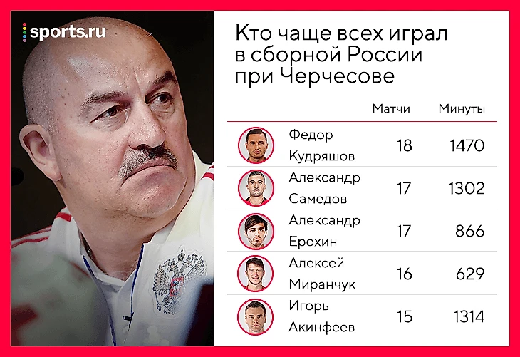 Сборная России со Станиславом Черчесовым сыграла 20 матчей. Довольно быстро стало понятно, что он делает ставку на сыгранность тройки центральных защитников, поэтому не так уж удивительно, что чаще всех играл Федор Кудряшов. Он был в старте в самом первом матче Черчесова и пропустил потом только два – против Коста-Рики (3:4) и «Динамо» (3:0), когда играл частично либо полностью экспериментальный состав.