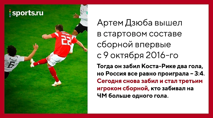 8 забитых голов – лучший результат сборной России на чемпионатах мира. Прежний рекорд был установлен на ЧМ-1994 – 7 голов, из которых шесть достались Камеруну.