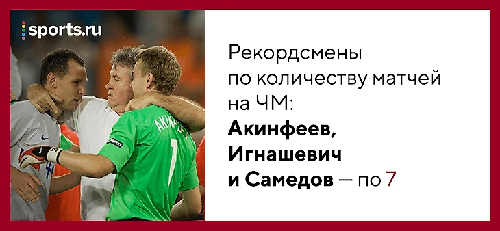• Игорь Акинфеев, Сергей Игнашевич и Александр Самедов – рекордсмены России по количеству матчей на чемпионатах мира: у всех по 7, собранные в 2014-м и теперь. Правда, Самедов провел полностью только 4 игры, Акинфеев и Игнашевич отработали без замен.