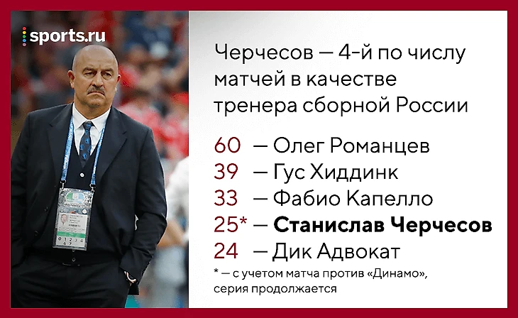 Больше только у Олега Романцева (60), Гуса Хиддинка (39) и Фабио Капелло (33). Зато Черчесов захватил лидерство по количеству матчей на ЧМ – у него 4 и будет 5-й, больше 3 нет ни у кого.