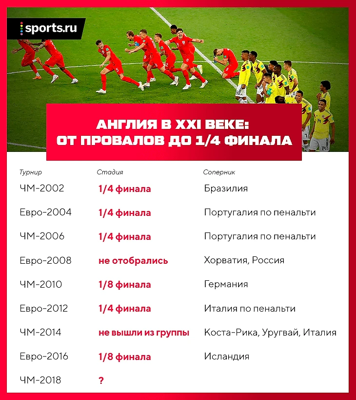 • Последний раз англичане добирались до 1/4 финала 12 лет назад. А выше были только дважды – в 1966-м (чемпионство) и 1990-м (4-е место).