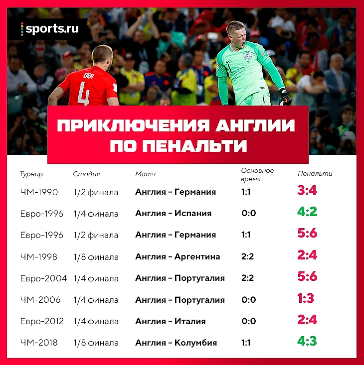 • Англия сломала традицию. Начиная с 1990-го, она проиграла 6 матчей из 7 – в серии 11-метровых. Перед ЧМ-18 команда даже специально тренировала пенальти – по видео Криштиану Роналду.