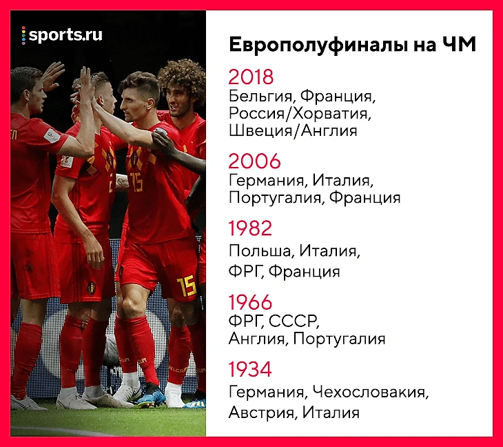 • Для Бельгии этот четвертьфинал стал третьим в истории, а в полуфинале до этого команда играла только раз – в 1986-м.