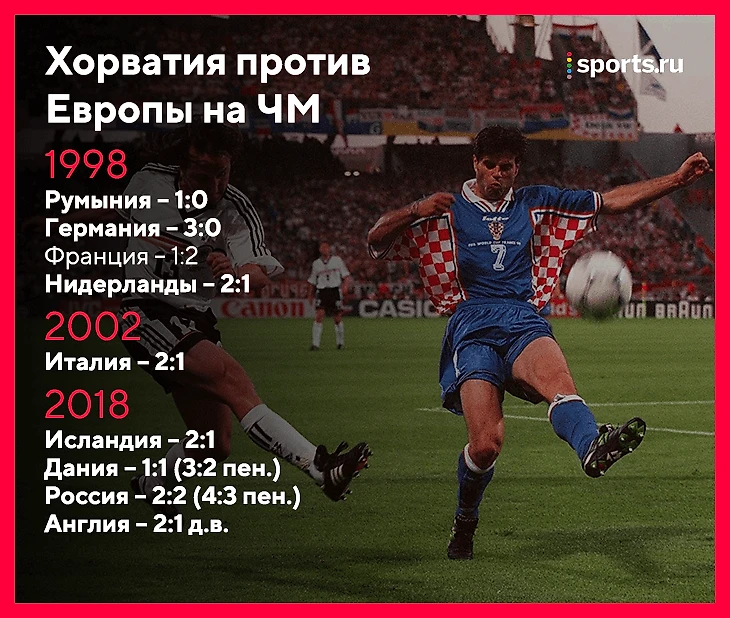 • До этого лета главным успехом хорватов была бронза ЧМ-1998: сборная с Шукером, Бобаном, Биличем и Просинечки, дебютировав на турнире, в плей-офф выбила Румынию с Германией. Сенсацию ЧМ остановили только будущие победители французы (2:1), зато в матче за третье место Хорватия свалила могучую Голландию Гуса Хиддинка.