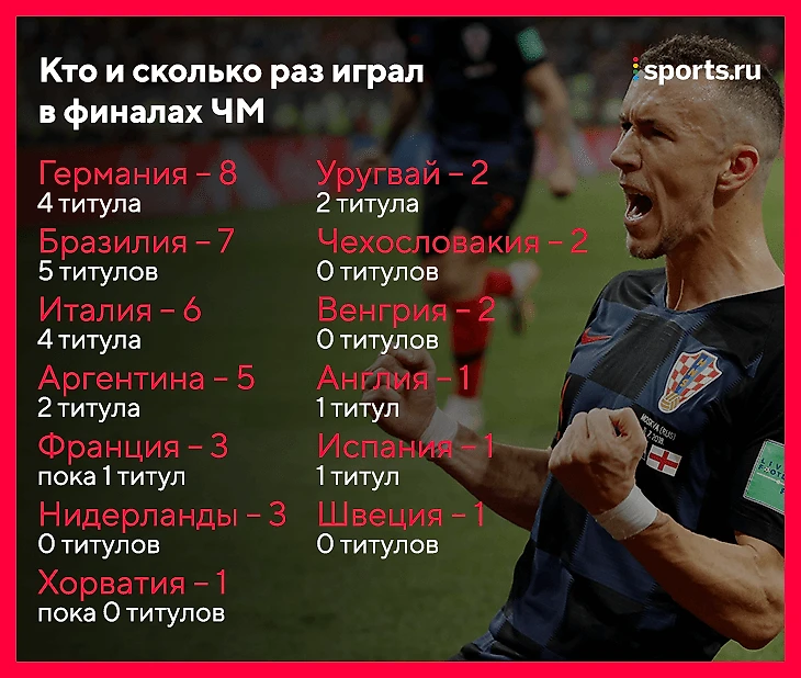 • Для Хорватии, которая обрела независимость от Югославии в 1991-м, это первый финал ЧМ – с пятой попытки. Хорватия – 13-я сборная, которая сыграет в главном матче турнира.