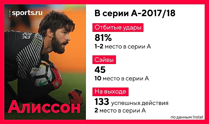 • Алиссон пришел в «Рому» из «Интернасьоналя» в 2016 году за 7,5 млн евро. В первый сезон он не сыграл в серии А ни одного матча – был дублером Войцеха Шченсного. И стал основным только после ухода поляка.
