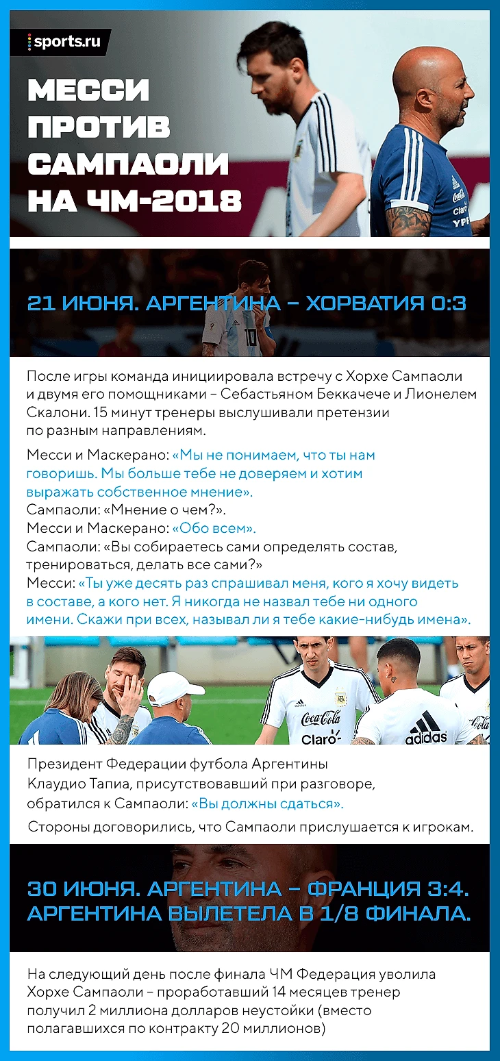 Аргентина с трудом вышла из группы, но вылетела в 1/8 финала от французов (3:4). Через две недели Сампаоли уволили. Тренер получил всего 2 миллиона долларов компенсации вместо полагавшихся 20.