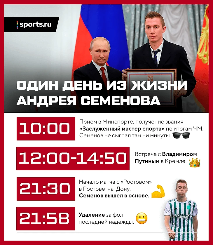 Один день Андрея Семенова: Минспорт, Кремль, красная карточка в Ростове