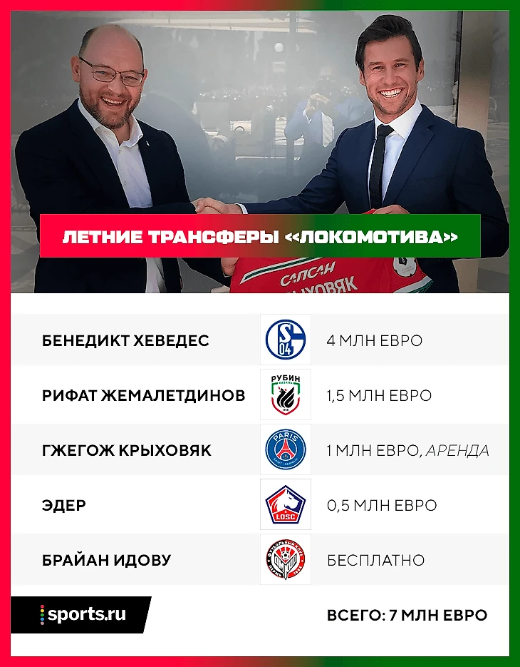 «Локо» шумит на трансферном рынке, но при этом всего лишь третий по тратам в РПЛ, если учитывать будущий переход Хеведеса. Впереди «Спартак» (9,5 млн на Жиго и Ташаева) и «Краснодар» (16 млн на Куэву, Спайич и Стоцкого). А без учета покупки Хеведеса «Локомотив» по тратам уступает даже ЦСКА (3,2 млн на Магнуссона и Бийола).