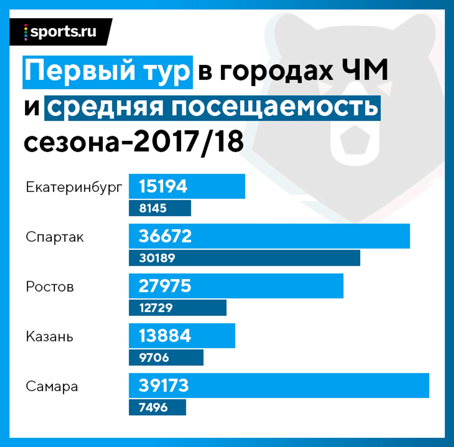 В городах чемпионата мира, где прошли матчи первого тура, все супер. Учитывайте, что в Екатеринбурге 15 тысяч (почти в два раза больше прошлогодней средней посещаемости) пришли на «Анжи». Значит, против топов цифры будут идеальными.