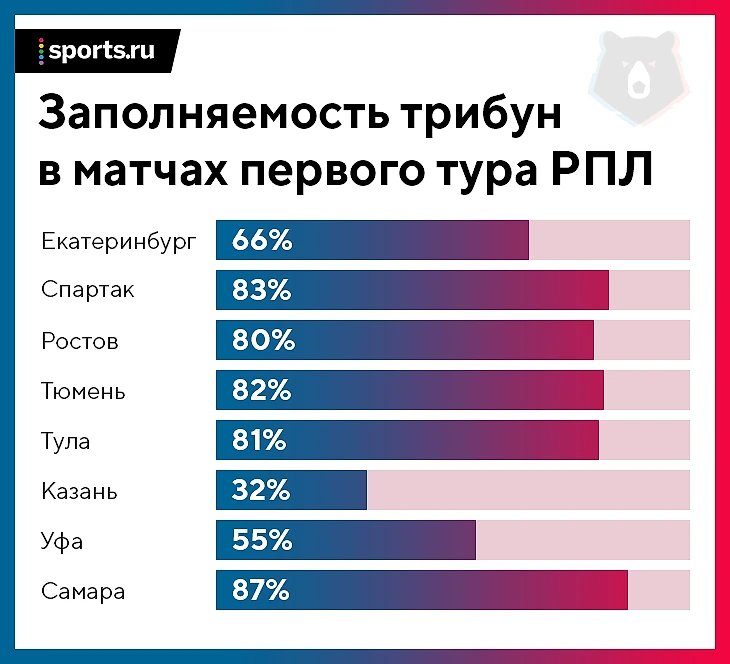 Чемпионат мира прошел мимо Уфы. Одна из самых маловместительных арен (15132) едва заполнилась наполовину в матче против чемпиона страны. Очень плохо. Худшая заполняемость в Казани, но это можно объяснить. «Рубин» перестал быть топовым клубом, а арена у него одна из самых вместительных в лиге (43 тысячи).