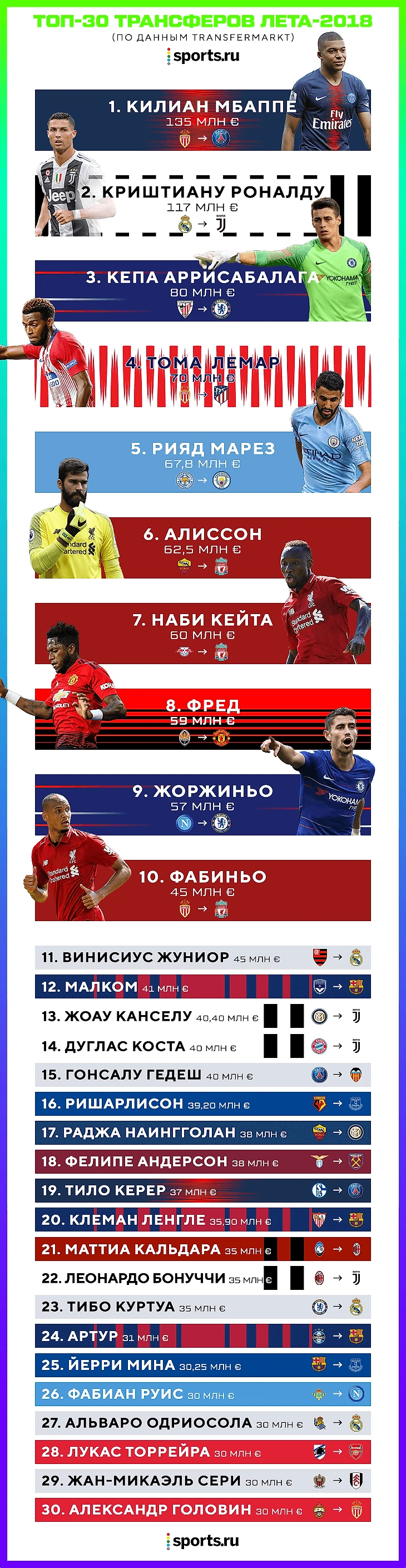 Этим летом не били общие трансферные рекорды. Однако ощущение безумия на рынке поддержали вратари: меньше чем за месяц Алиссон («Ливерпуль») и Кепа («Челси») побили рекорд Буффона, который держался больше 15 лет. Кроме того, впервые за много лет в топе европейских трансферов оказался российский игрок.
