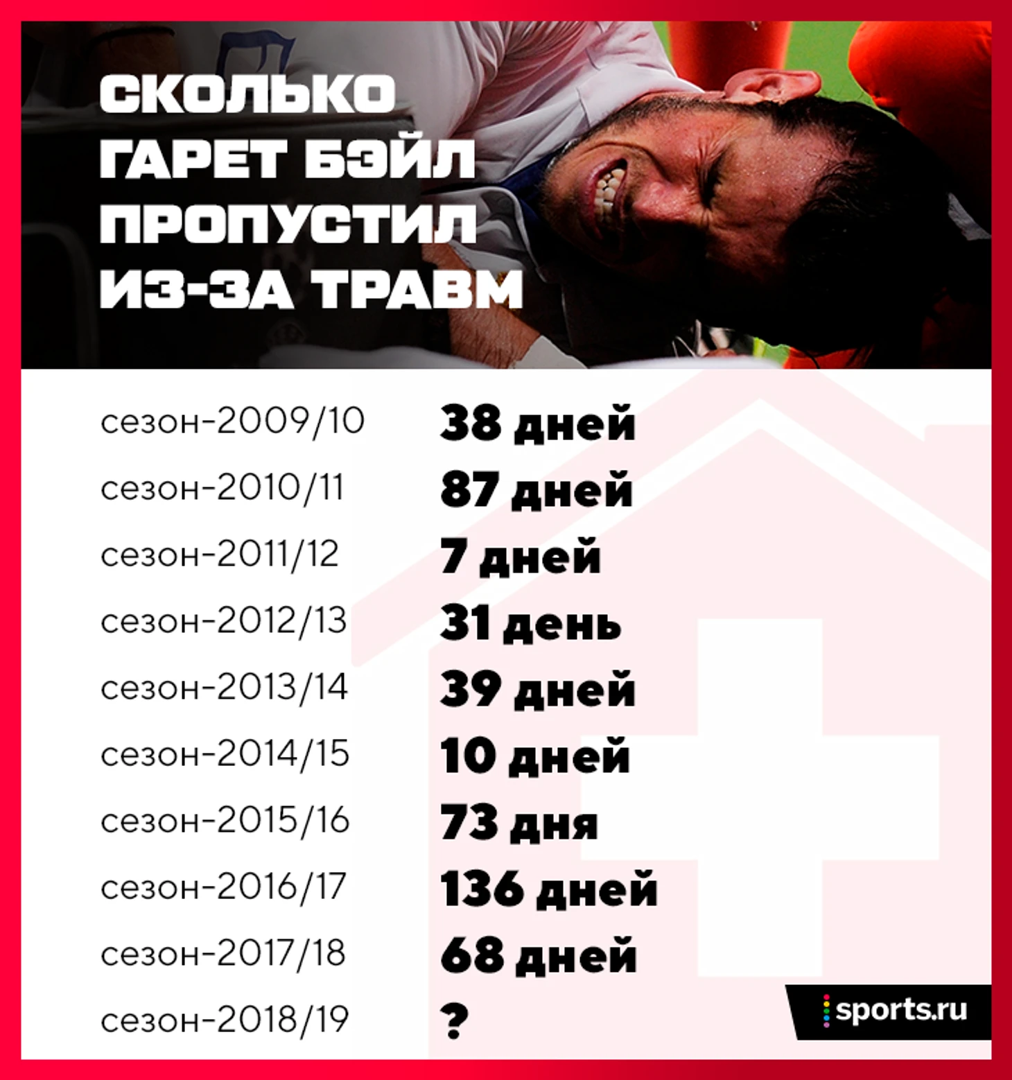 Травмы донимают Бэйла всю карьеру, но после того, как валийцу исполнилось 26, проблемы стали серьезнее. До сезона-15/16 он в среднем пропускал по месяцу. Исключение – 2011-й год, когда Бэйл получил разрыв связки голеностопа. Но тогда игрок травмировался перед финишем сезона и суммарно пропустил только три матча.