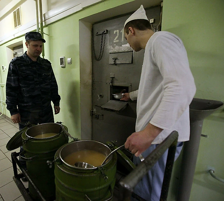 • Еда – три раза в день. На питание одного заключенного в России в 2018 году тратится 72 рубля в сутки. «Завтрак: каша (возможно, молочная) или овощное рагу, чай с сахаром, хлеб. Обед: салат (например, соленые помидоры и огурцы), первое, второе, хлеб, компот. На ужин рыба — навага жареная с картофельным пюре, чай и хлеб», – писал Znak.com о типичном меню в 2017 году.