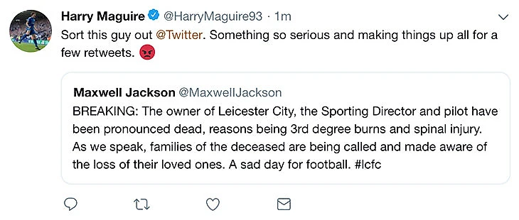Защитник «Лестера» Харри Магуайр просил вышвырнуть из твиттера тех, кто распространяет слухи о погибших.