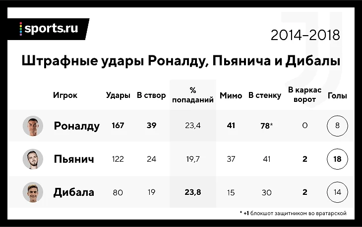 • По данным InStat (запрошены Sports.ru после матча «Ювентуса» против «МЮ»), в этом сезоне Криштиану 28 раз бил штрафные, из них 9 – в створ. У Пьянича и Дибалы – по 3 удара (0 в створ). А вот статистика за последние 5 сезонов (4 полных + 3,5 месяца текущего).