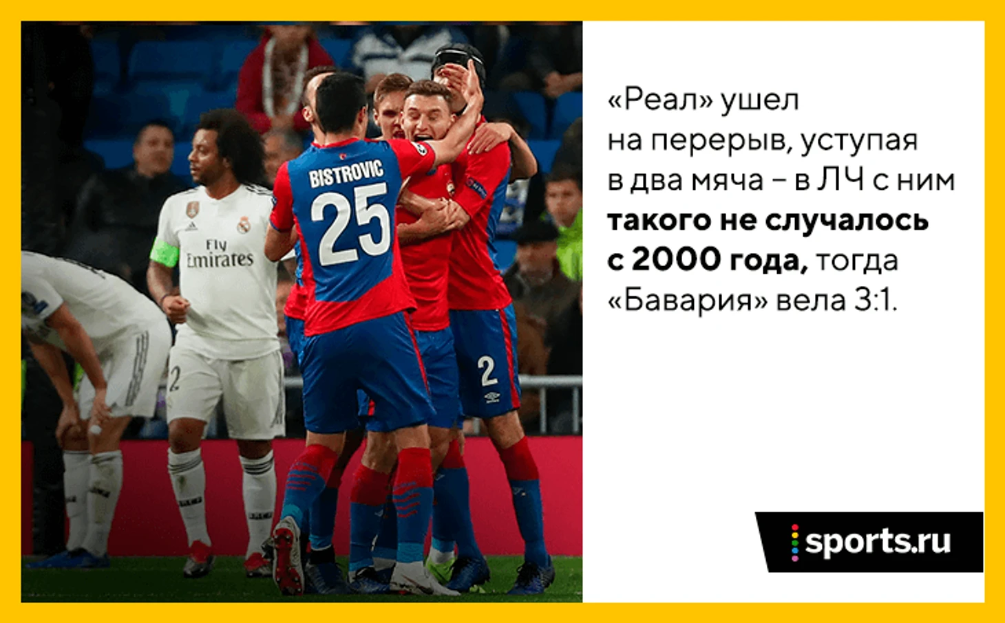 • ЦСКА стал первым клубом за 6 лет, забившим на «Сантьяго Бернабеу» в ЛЧ два или больше голов в первом тайме. Осенью 2012-го «Реал» и «Боруссия» уходили на перерыв при счете 1:2.