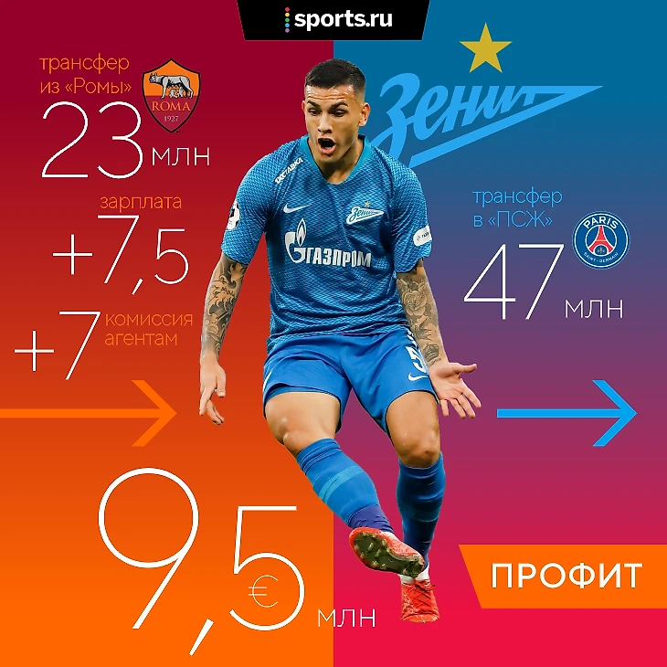 • Питерский клуб в итоге оказался в плюсе. Паредес провел в российском клубе 18 месяцев и заработал за это время 7,5 млн евро (зарплата 5 млн евро в год). Суммарно аргентинец обошелся «Зениту» в 37,5 млн евро. Таким образом, профит клуба – 9,5 млн евро. Почти за эти же деньги питерский «Зенит» приобрел у «Шахтера» защитника Ярослава Ракицкого.