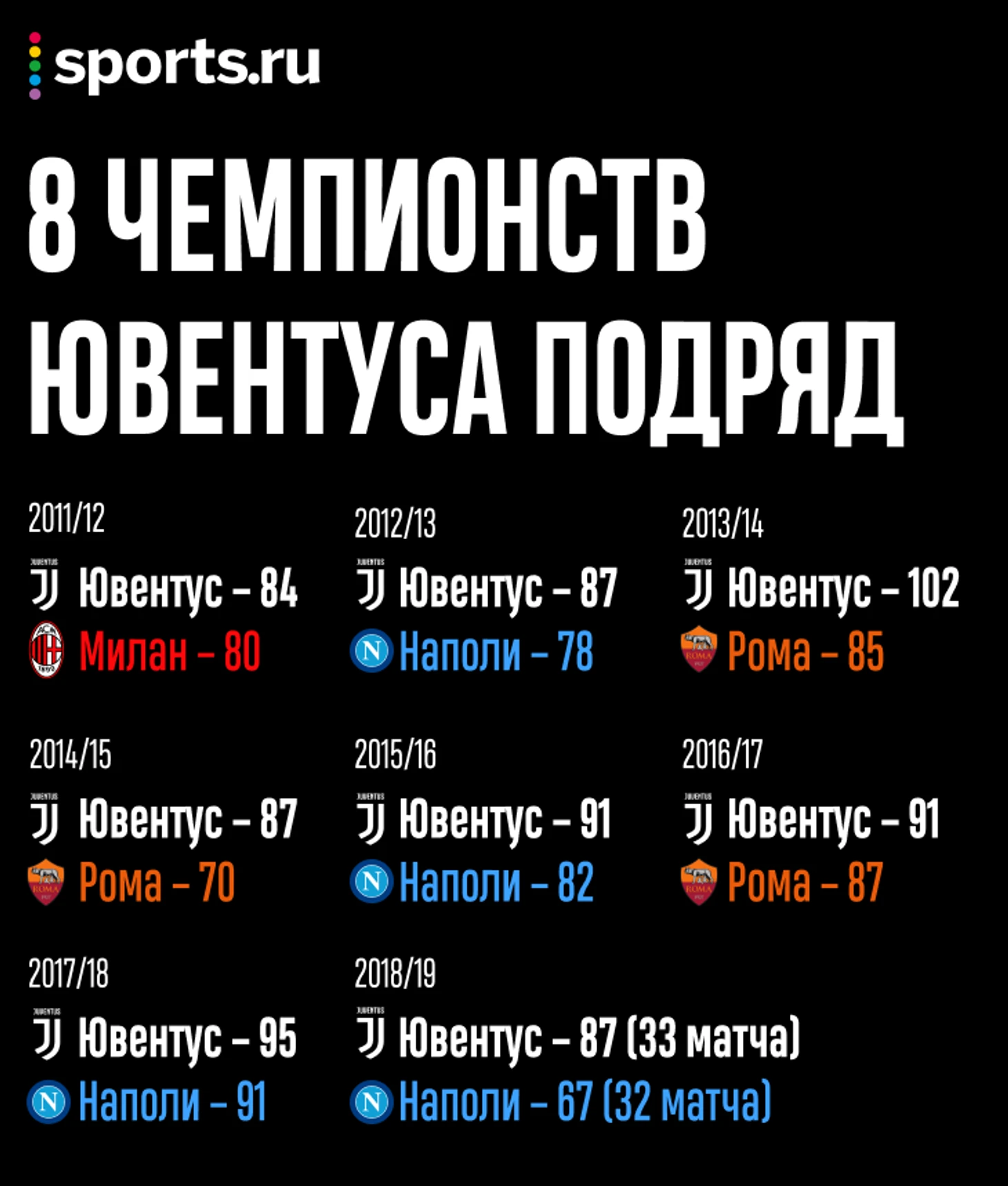 • Обыграв «Фиорентину», «Ювентус» в 35-й раз стал чемпионом Италии. Это 8-е подряд чемпионство клуба – рекорд Италии и топ-5 лиг Европы. «Юве» побил достижение «Лиона», который с 2002 по 2008 год взял семь подряд титулов.