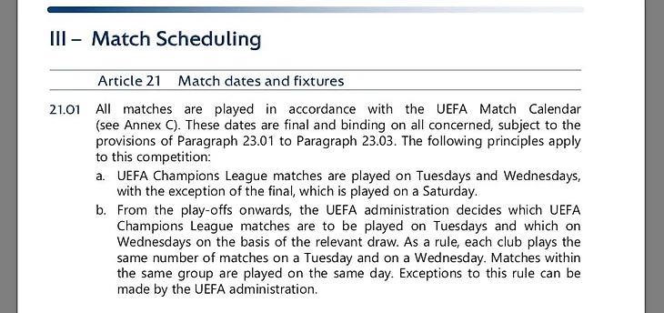 Ответ на вопрос Сульшера был там же, где он искал. Регламент ЛЧ УЕФА гуглится за несколько секунд. Там есть статья 21, ее смысл такой: на каждой стадии все команды должны играть одинаковое количество матчей по вторникам и средам (чтобы сохранялся баланс для подготовки к матчам выходных). На групповом этапе у каждого клуба три матча во вторник, три – в среду. То же самое в плей-офф.