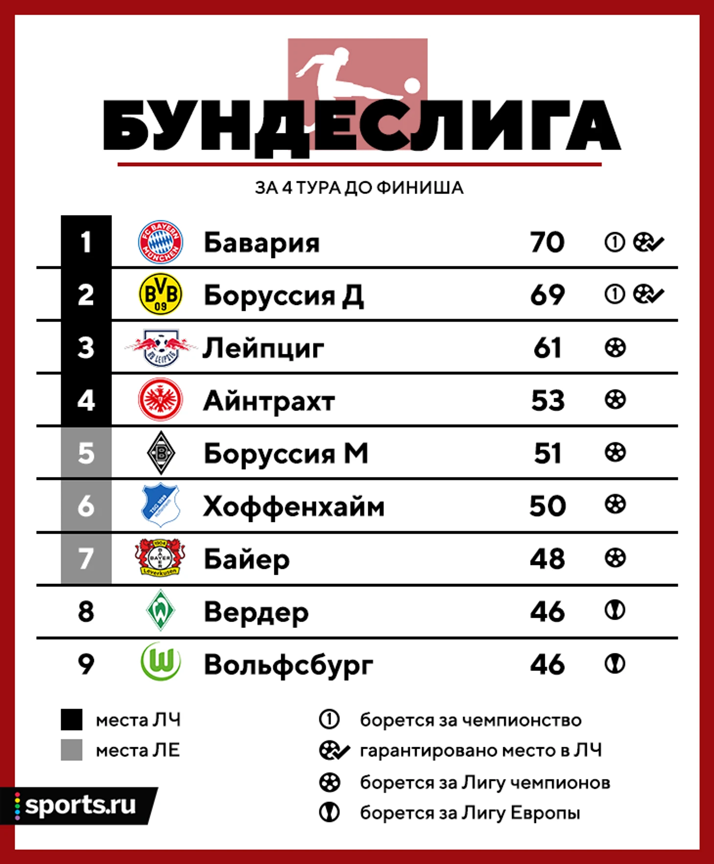 • Чемпионская гонка здесь такая же мощная, как и в АПЛ. У «Баварии» впереди матчи: против «Нюрнберга» (в гостях), «Ганновера» (дома), «Лейпцига» (в гостях), «Айнтрахта» (дома). По соперникам полный баланс: первые два в зоне вылета, вторые – в зоне еврокубков.
