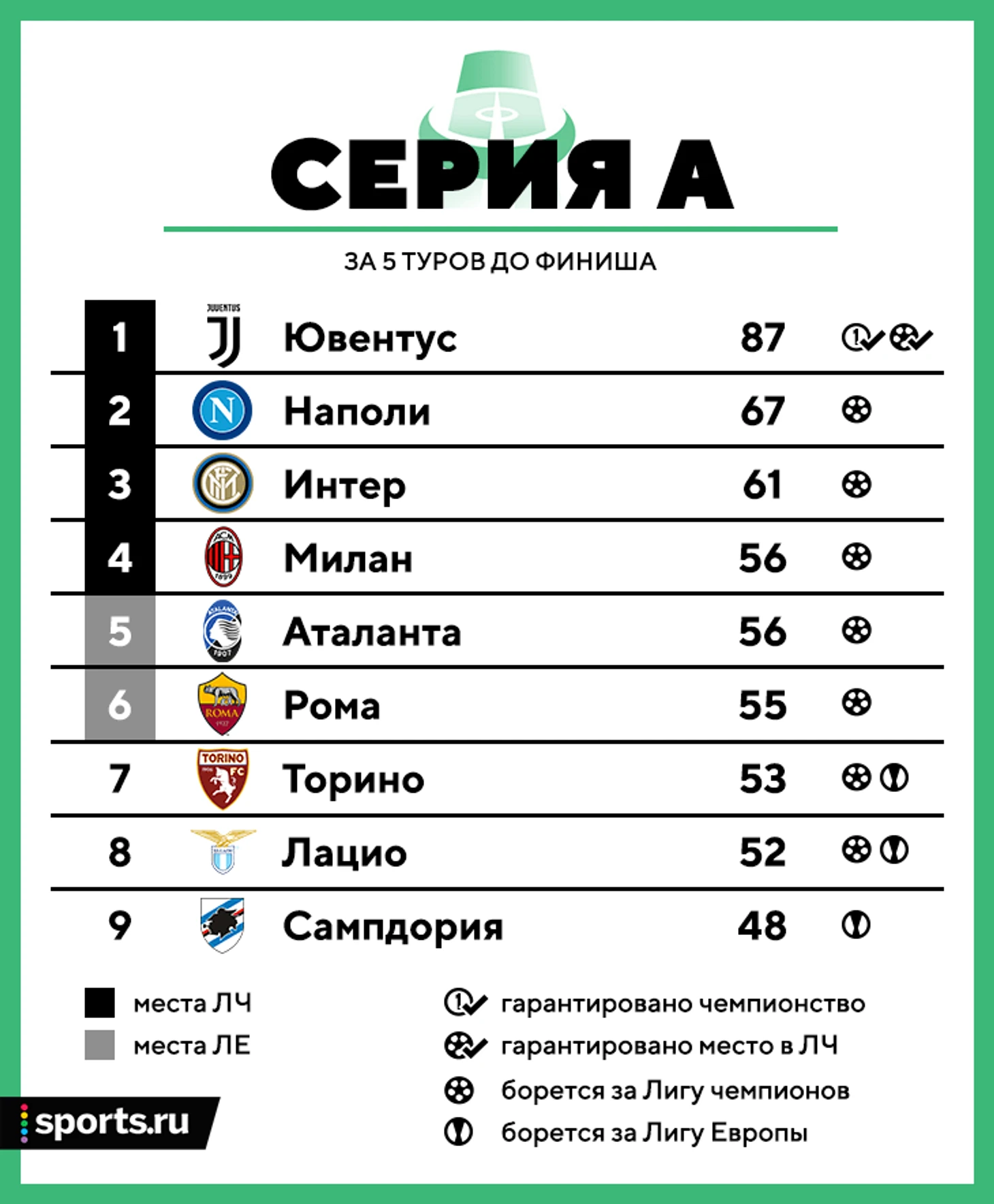 • Все задачи на сезон решил «Юве» и отчасти «Наполи» (для бронирования места в ЛЧ лучше набрать в оставшихся пяти матча три-пять очков). За остальные два места будет драка – разрыв между четвертой и восьмой командой – 4 очка (шансы есть даже у «Торино» и «Лацио»). Интересно, что в финальных турах «Юве» протестирует всех ее участников, кроме «Милана» и «Лацио».