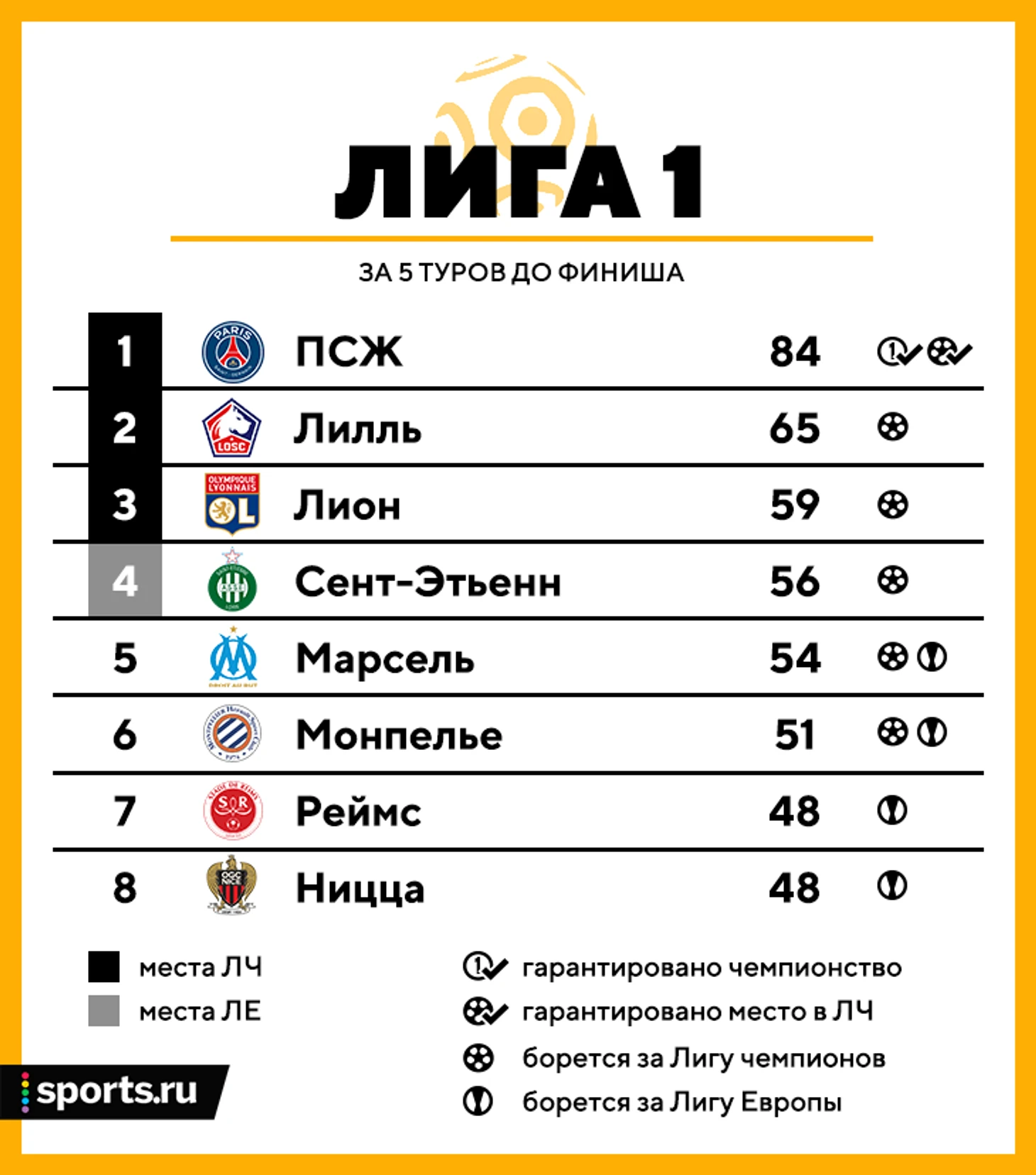 • От Франции напрямую в групповой этап ЛЧ идут только две команды. Второй должен стать «Лилль», которому нужно не растерять 6 очков преимущества за пять туров. Третья команда лиги 1 попадает в квалификацию ЛЧ, четвертая – в Лигу Европы.