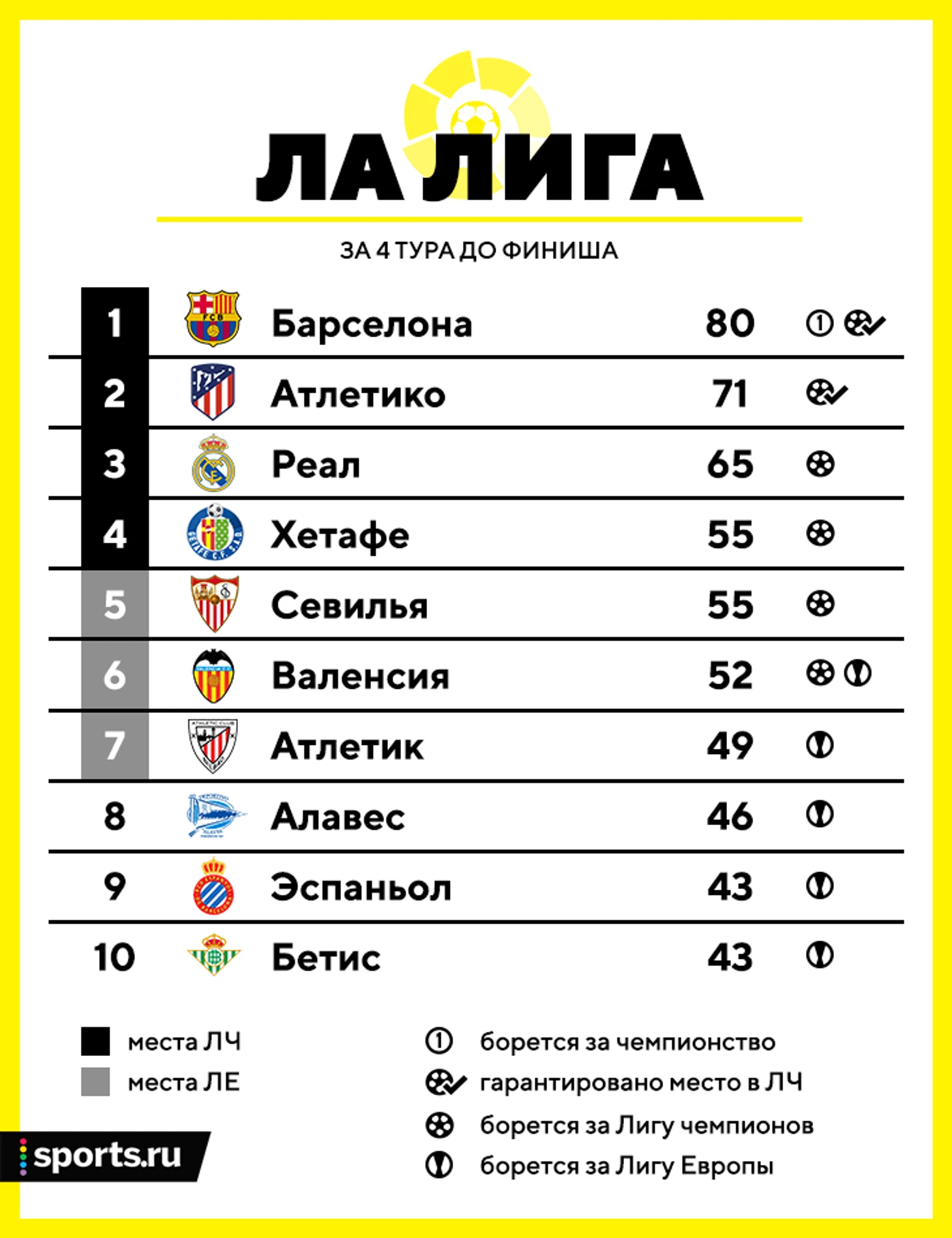• Формально «Реал» еще не обеспечил себе место в ЛЧ, но это случится уже скоро. А вот за четвертое место в турнире будут биться «Хетафе», «Севилья» и «Валенсия». Пока лидер в борьбе – «Хетафе». Да, у них выездной матч с «Барсой», но немотивированной – это будет в 37-м туре. Теоретически до четвертого места может допрыгнуть даже «Алавес».