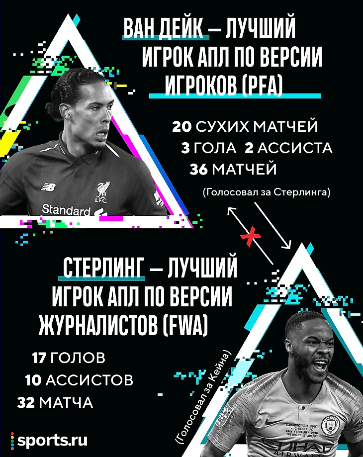 В Англии объявили лучших игроков сезона АПЛ по двум главным версиям – самих игроков (PFA – Professional Footballers’ Association) и журналистов (FWA – Football Writers’ Association). Мнения разошлись – профсоюз выбрал защитника «Ливерпуля» Вирджила ван Дейка, пресса – вингера «Ман Сити» Рахима Стерлинга.