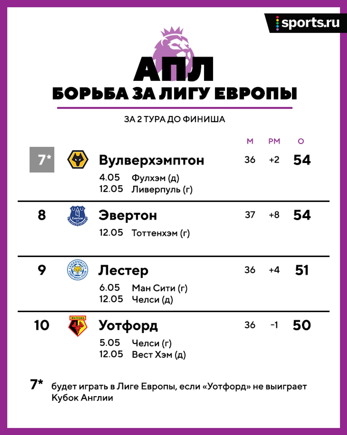 • В невероятном варианте из прошлого пункта с победой двух английских команд в еврокубках и их финишем за пределами топ-4 в ЛЕ попадут 4-я команда чемпионата и либо «Уотфорд» как победитель Кубка, либо 7-я команда АПЛ. То есть от Англии в ЛЕ в таком варианте сыграют всего две команды, 8-му месту в АПЛ в любом случае ничего не достанется.