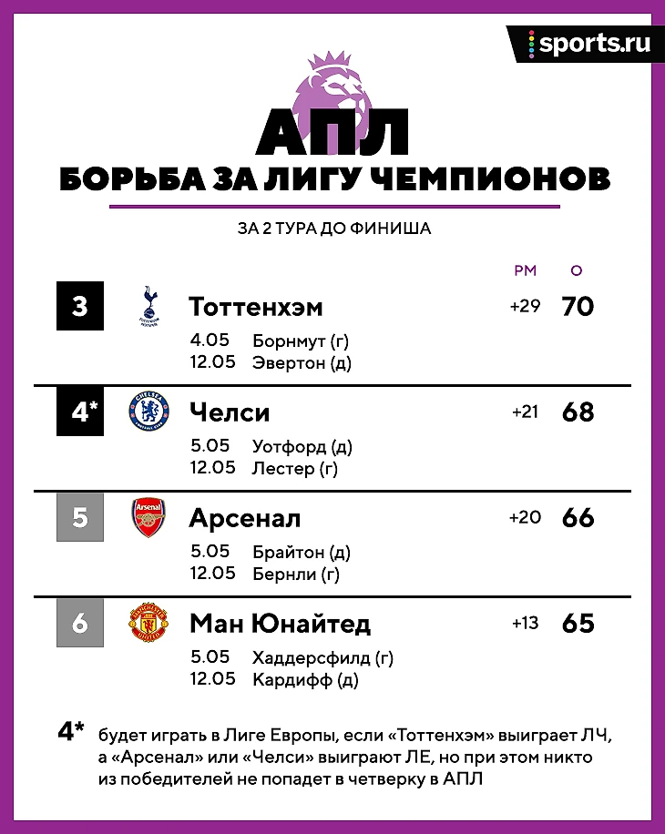 • «Манчестер Сити» и «Ливерпуль» давно тут себе все обеспечили. За два оставшихся места сражаются четыре команды. Не пытайтесь что-то прогнозировать – в последних трех матчах «Тоттенхэм» набрал 3 очка из 9 возможных, «Челси» – 2, «МЮ» – 1, а «Арсенал» – 0.